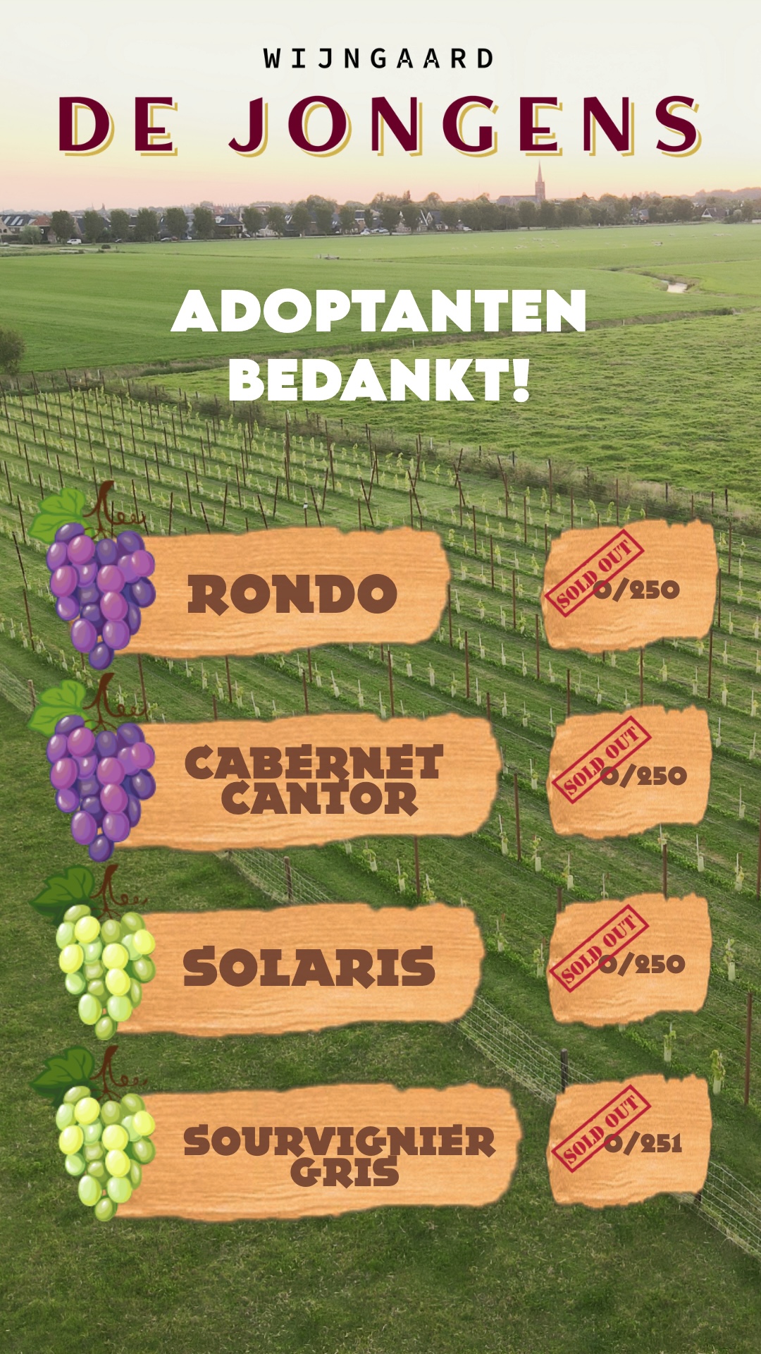Alle 500 ter adoptie gestelde wijnranken hebben inmiddels een ouder gevonden, we zijn trots en dankbaar dat zoveel mensen zich hebben aangesloten bij De Jongens. Samen Beter Genieten.