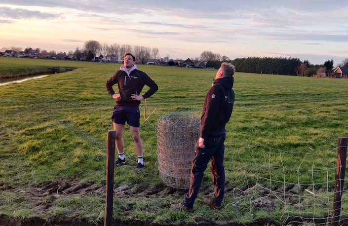 Eerst het perceel maar eens opknappen, de ranken moeten er wel netjes bij staan. Tijd voor een nieuw hek dus. In de barre kou gaan de palen voor het hek de grond in, tijdens de eerste echte werkzaamheden op de wijngaard-to-be. De buurman spuit in ruil voor een krat bier de drainage door en graaft een greppel om de ergste regenval af te kunnen voeren. Tot het vroege donker en met stijf bevroren handen worden met behulp van vriend Dirk alle palen gezet en het gaas uitgerold. Eindresultaat? Blaren op de handen en een keistrakke nieuwe erfscheiding.