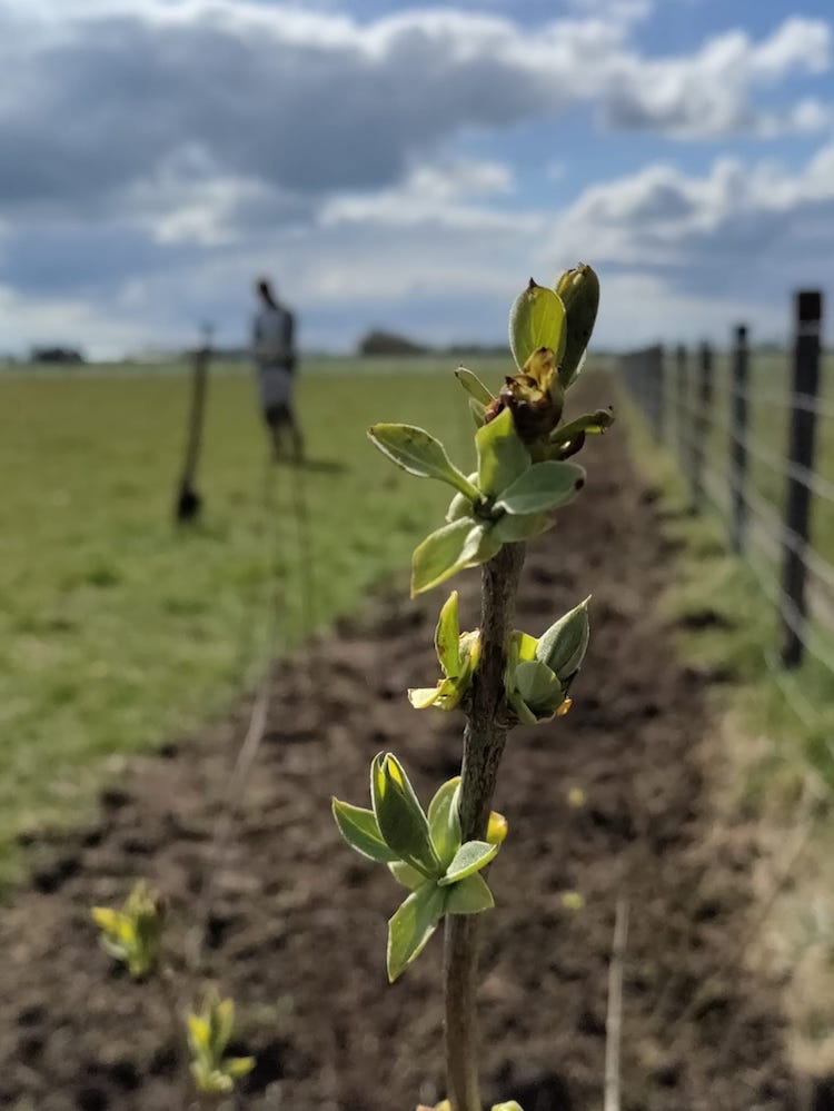 Tijd voor de eerste planten op de wijngaard, weliswaar nog geen druivenstokken, maar er groeit vanaf nu echt wat: een windhaag. Na wat opstartproblemen met de frees waaruit blijkt dat het landbouwenthousiasme groter is dan de -ervaring, wordt er over de complete lengte van het perceel een baan gefreesd. De diversiteit aan planten, bomen en struiken moet straks onze stokken uit de volle wind houden. Daarnaast moet de windhaag onderdak gaan bieden aan verschillende insecten. Een regeneratieve wijngaard waar biologische wijn mee wordt geproduceerd terwijl de biodiversiteit wordt verhoogd, dat is het idee.