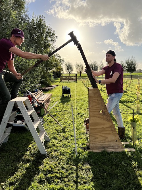 Langzaam gaat het er bij De Jongens uitzien als bij een echte wijngaard, het leidsysteem wordt geplaatst. Stap één is het aanbrengen van de grondankers. Hiervoor is een vochtige grond belangrijk, maar dan nog is het met z’n tweeën een kwartier draaien per anker. Daarna gaan de schuine eindpalen en vervolgens de verticale tussenpalen de grond in. De cortenstalen palen hebben eerst een aantal maanden liggen roesten en kunnen nu dan eindelijk de grond in. Als deze in de loop van volgend jaar rechtop staan, kunnen de draden ertussen worden gespannen.