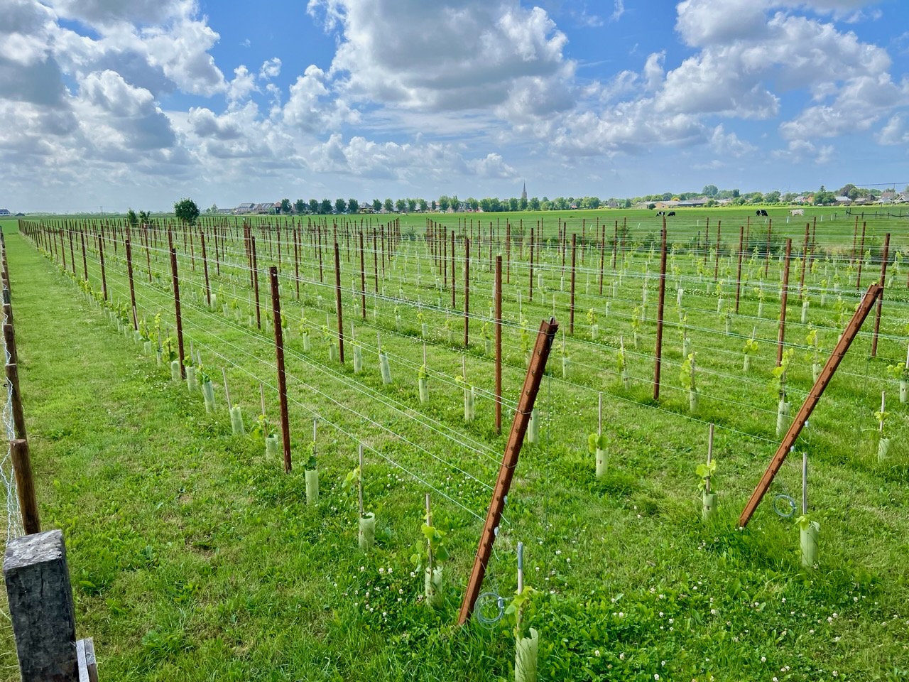 Het is weken, of eigenlijk maanden zwoegen geweest, maar inmiddels staan alle palen van het leidsysteem op hun plek. De draden zijn gespannen, de ranken kunnen omhoog en mogen zich vasthouden aan hun klimrek. Het ging niet vanzelf, sommige palen zijn meer dan één keer op hun plek gezet, maar het eindresultaat neigt naar perfectie.